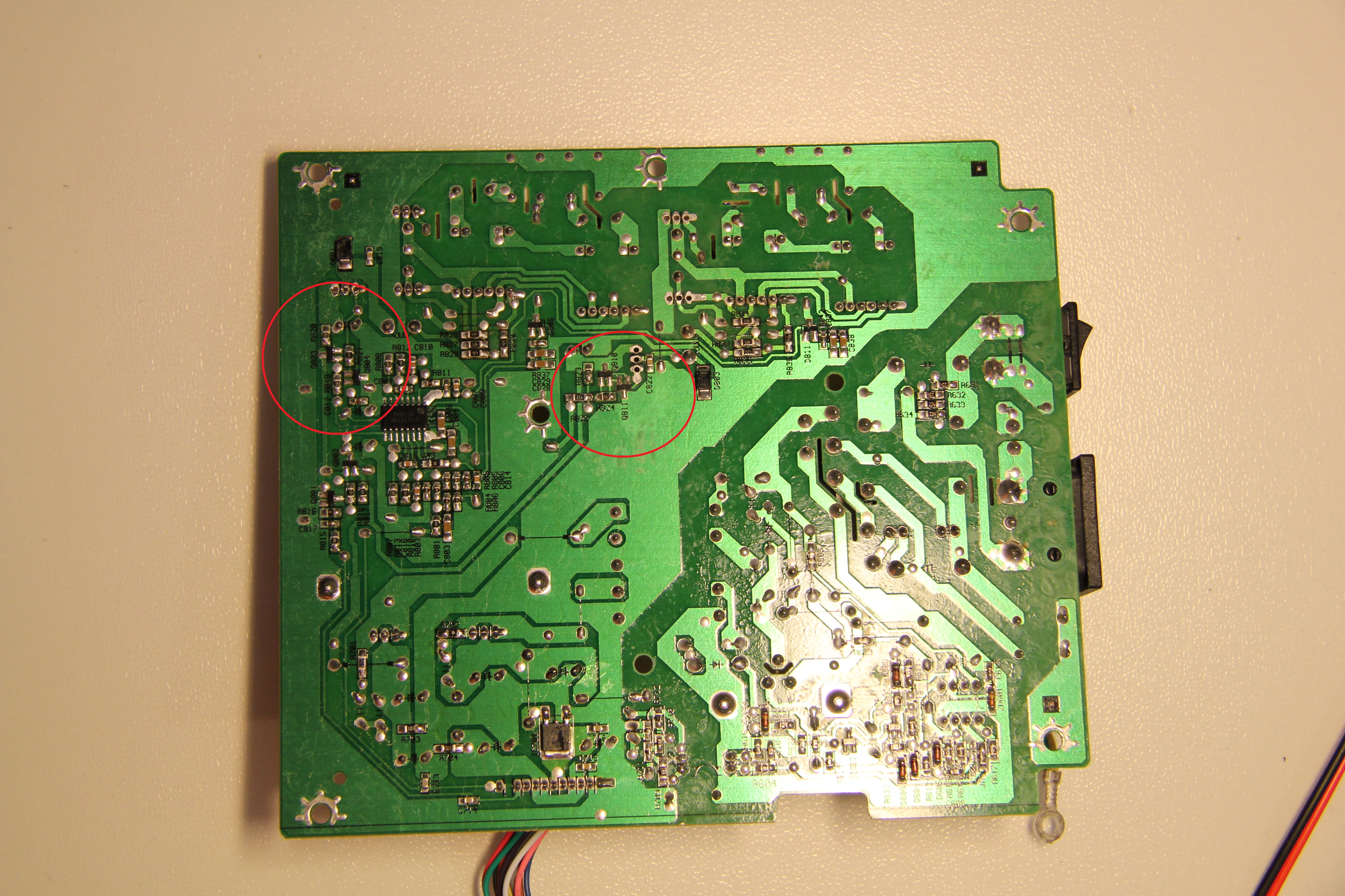 Update 11.10.2011: Die Netzteilplatine des HP L1955 hat die Bezeichnung Benq 48.L1A02.A00. Bei eBay finden sich bei einer Suche nach der Platine oder den Typbezeichnungen der defekten Transistoren (z.B. C5707 oder FU9024N) Bauteilkits für die Reperatur des Geräts.