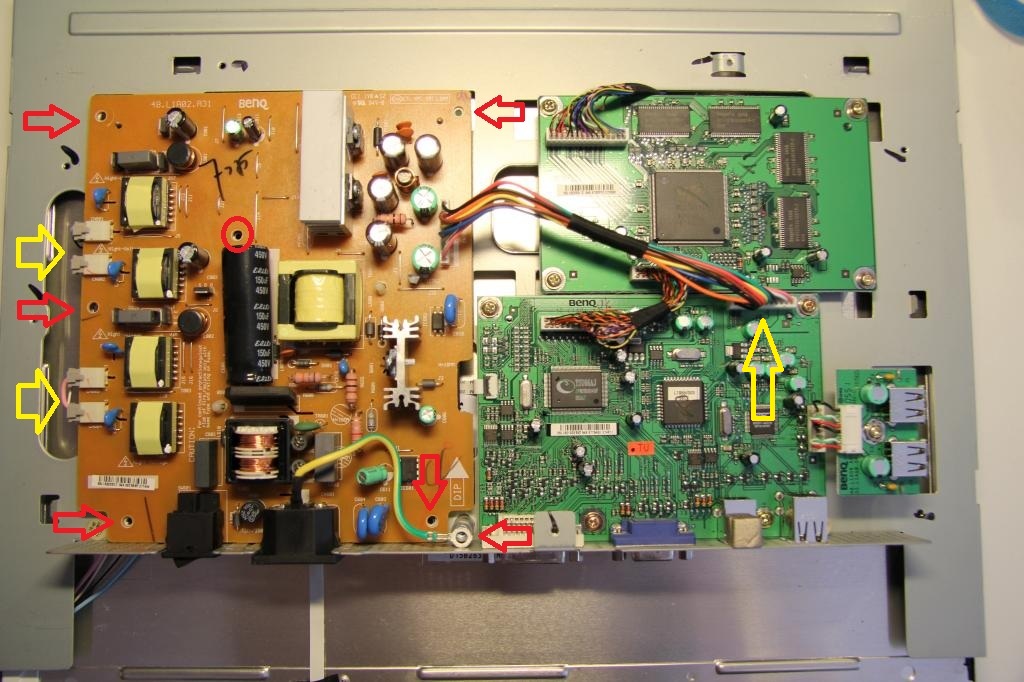 Nun muss die Netzteilplatine demontiert werden. Dazu erst die Stecker (im Bild gelb markiert) und danach die Schrauben (im Bild rot markiert) lösen. Danach kann die Platine entfernt werden.