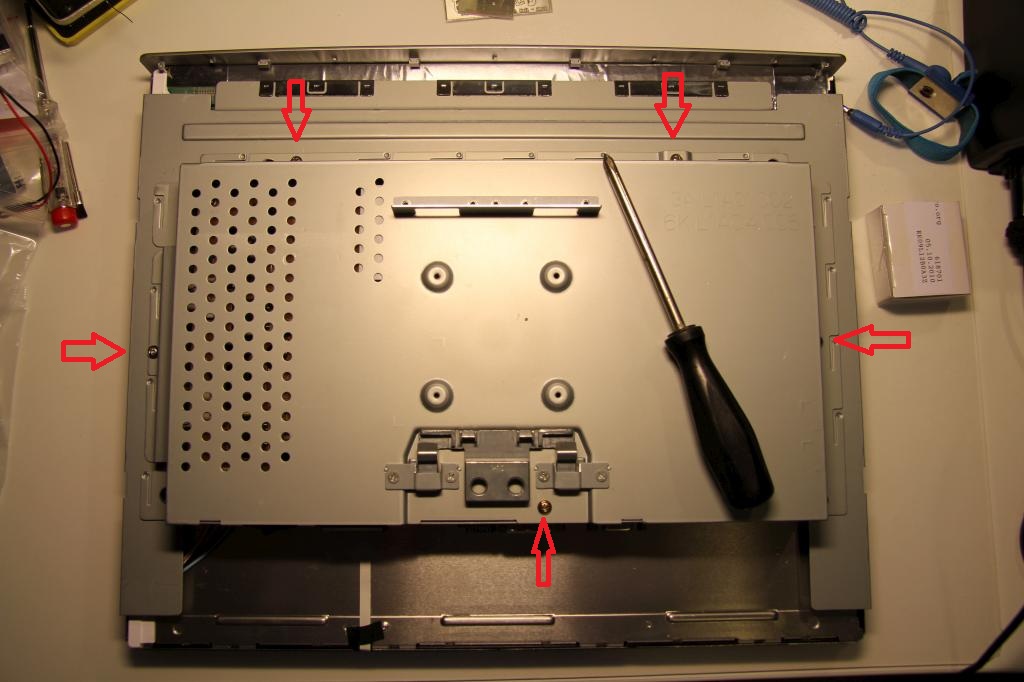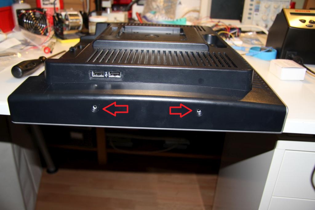 Zunächst müssen die Schrauben an der Seite gelöst werden. Diese befinden sich hinter runden Aufklebern die einfach mit einem dünnen Schraubenzieher/Messer gelöst werden. Die Verkleidung ist noch mit Clips befestigt. Wenn die Schrauben raus sind, den Monitor mit dem Display nach unten auf eine plane Oberfläche legen und die Verkleidung entfernen.
