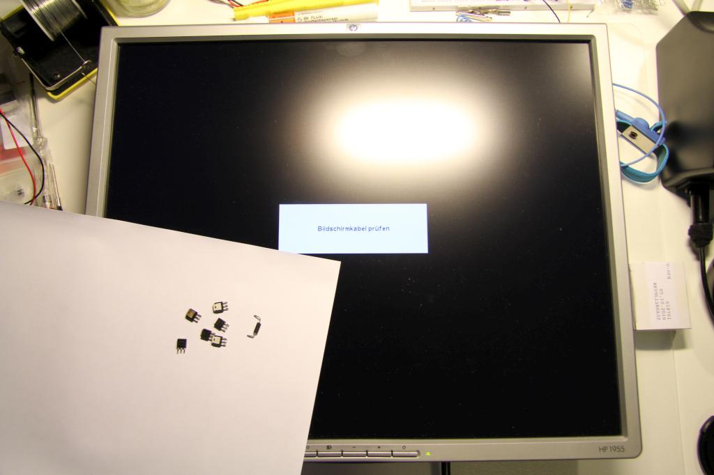 Vor kurzem bekam ich einen HP L1955 zum reparieren. Der Monitor war mit einem Knall und einer kleinen Rauchwolke abgetreten. Ich schaltete den Monitor ein und er blieb dunkel obwohl die Power LED leuchtete. Bei genauerem Hinsehen zeigte sich jedoch, dass die Anzeige arbeitete. Die Hintergrundbeleuchtung war jedoch ausgefallen, das Bild konnte man nicht erkennen. Da in dem Monitor 2 CCFL Röhren verbaut sind und der Ausfall beider zur gleichen Zeit unwahrscheinlich war, tippte ich auf einen Defekt im Netzteil. Und in der Tat befanden sich auf der Netzteil Platine Rauchspuren und zwei angebrannte Transistoren.