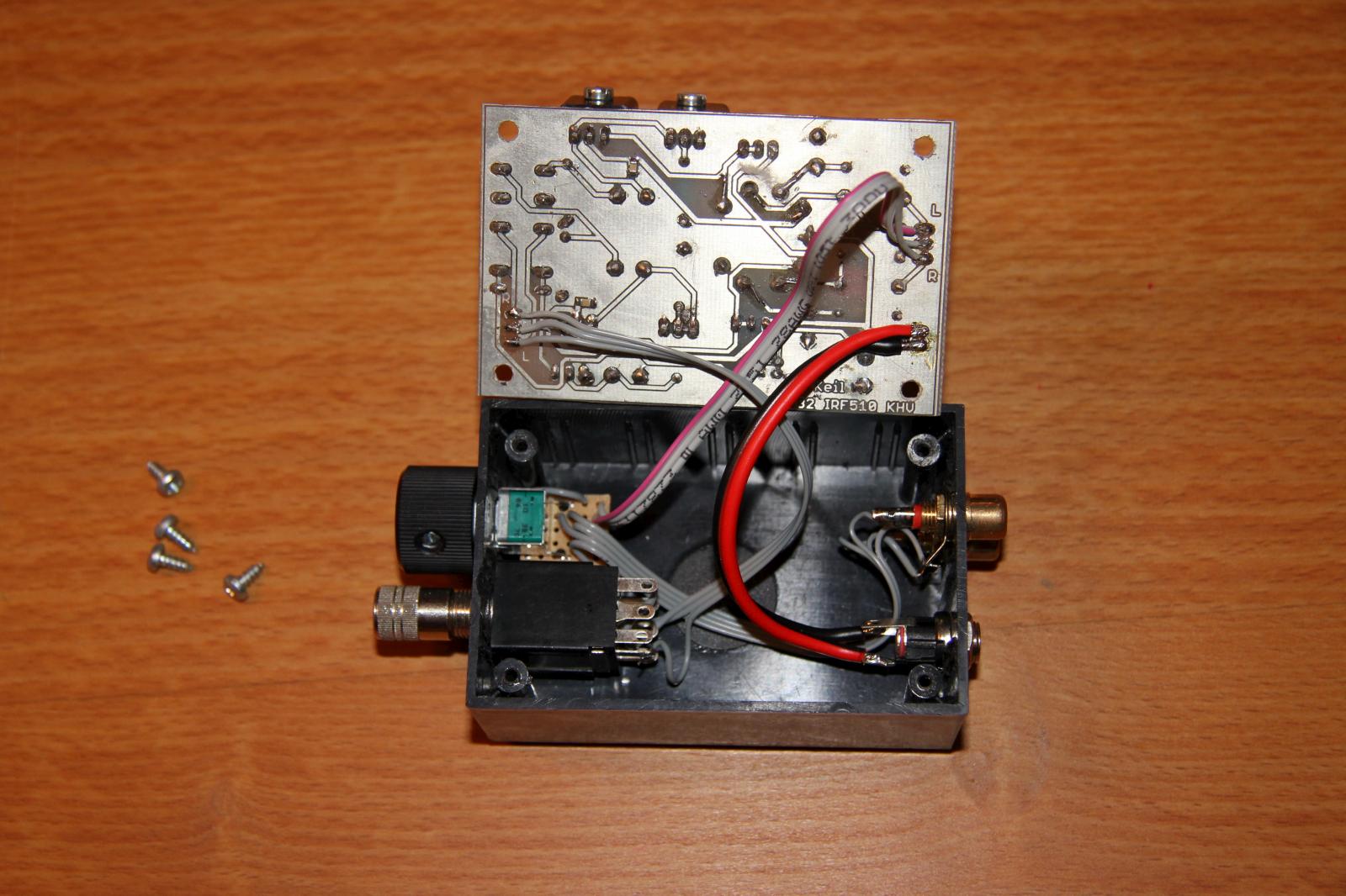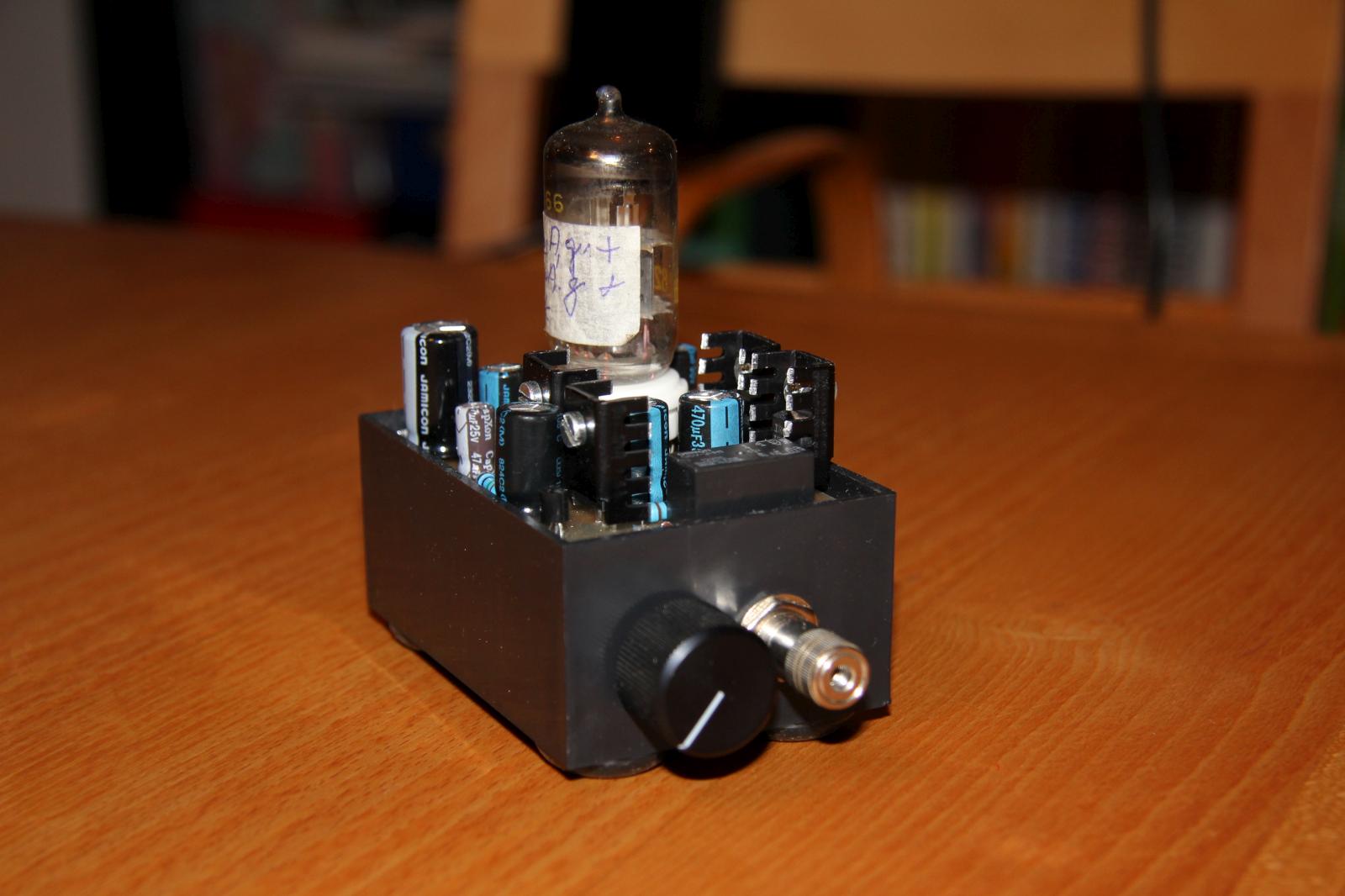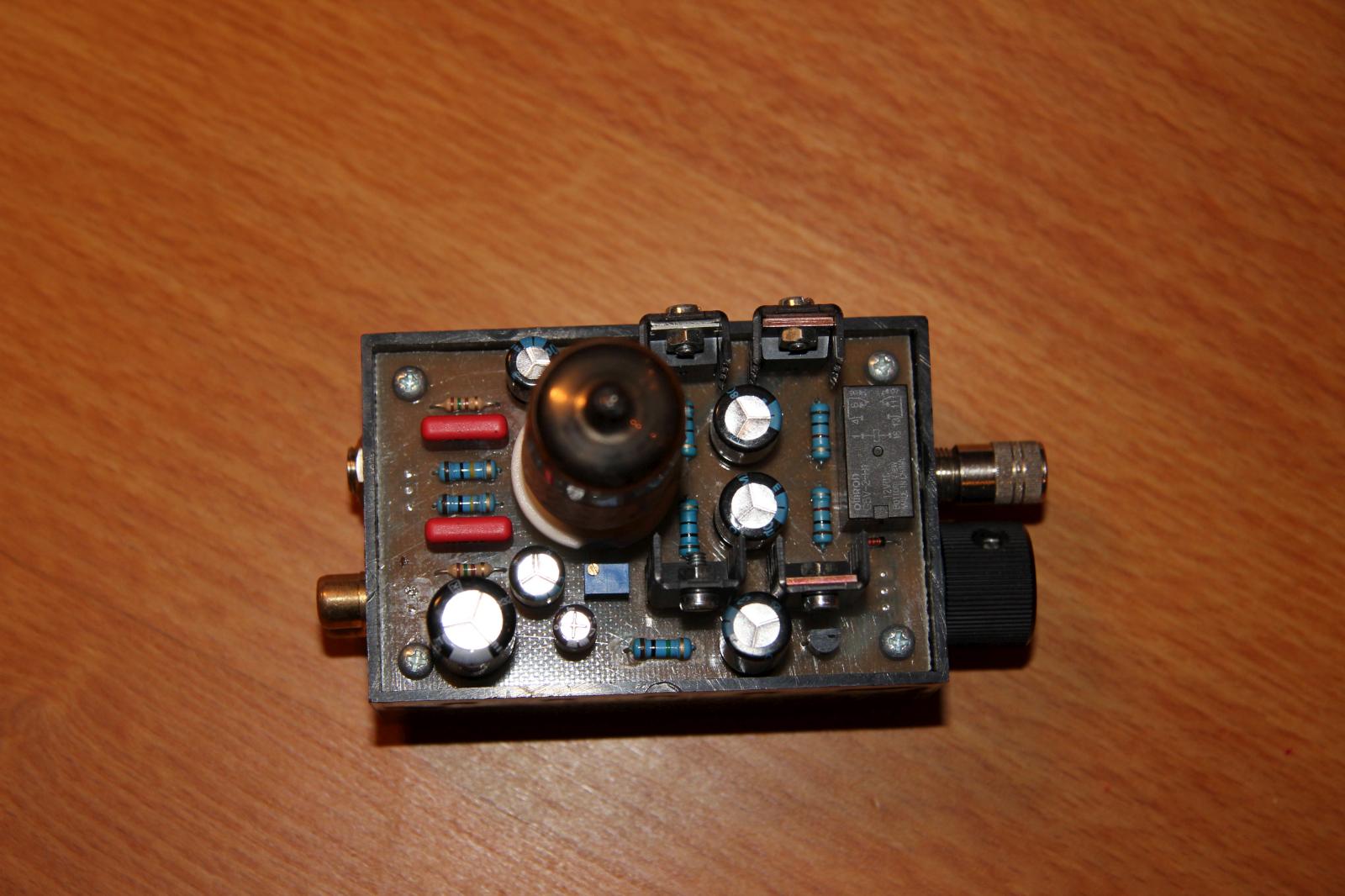 Den Schaltplan habe ich im Großen und Ganzen übernommen. Vor den Kopfhörerausgang habe ich eine Anschaltverzögerung basierend auf der Schaltung des Millet Hybrid MAX e12 Delay gesetzt. Die Verzögerung beträgt in etwa 30 Sekunden, bis dahin ist die Röhre warm und die Kapazitäten am Ausgang aufgeladen. Vom Aufbau der Schaltung habe ich leider keine Bilder. Es gab dabei ein Problem: die Bohrungen für den Röhrensockel waren zu klein, ich musste sie aufbohren und habe die Pads anschließend mit Silberdraht verstärkt.