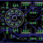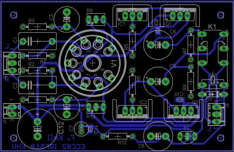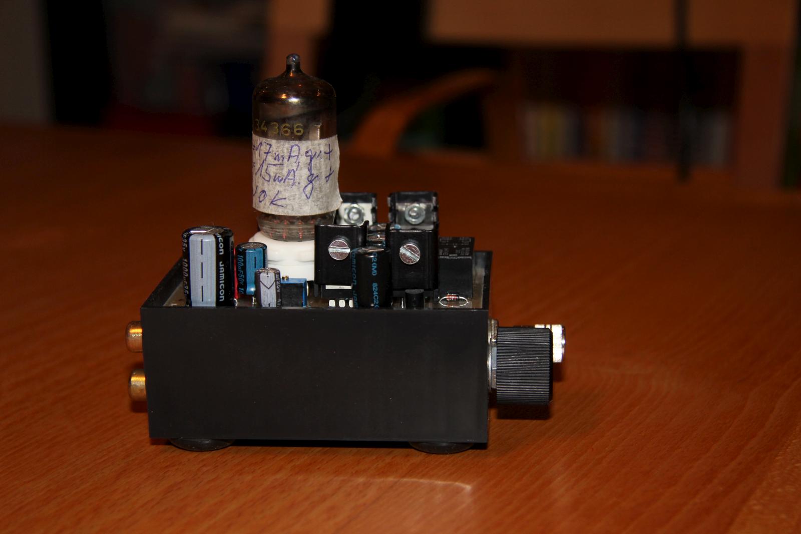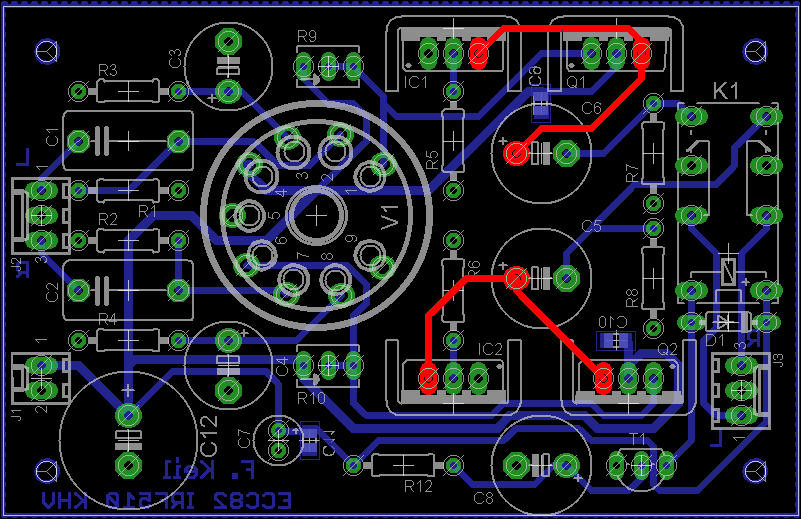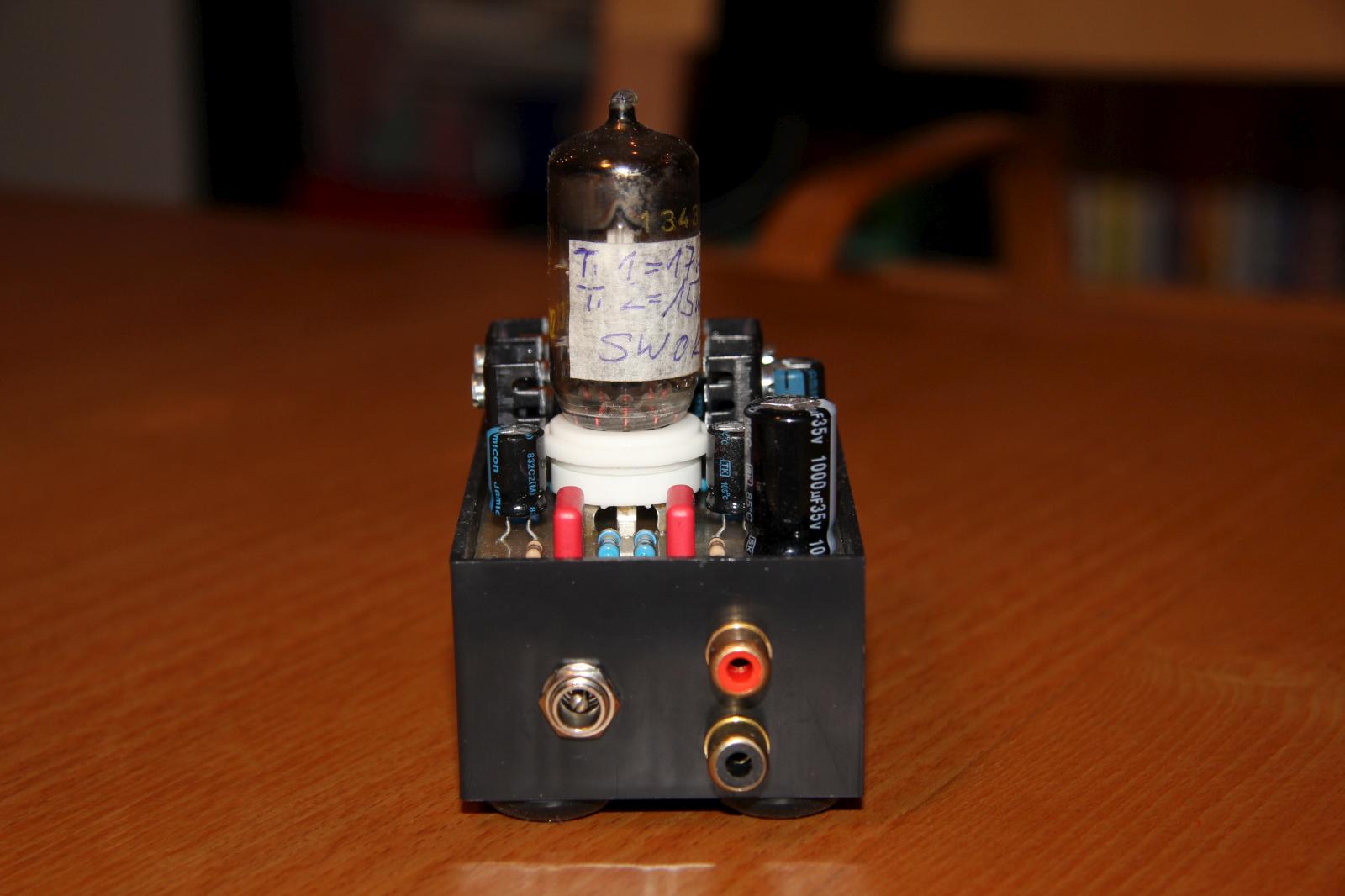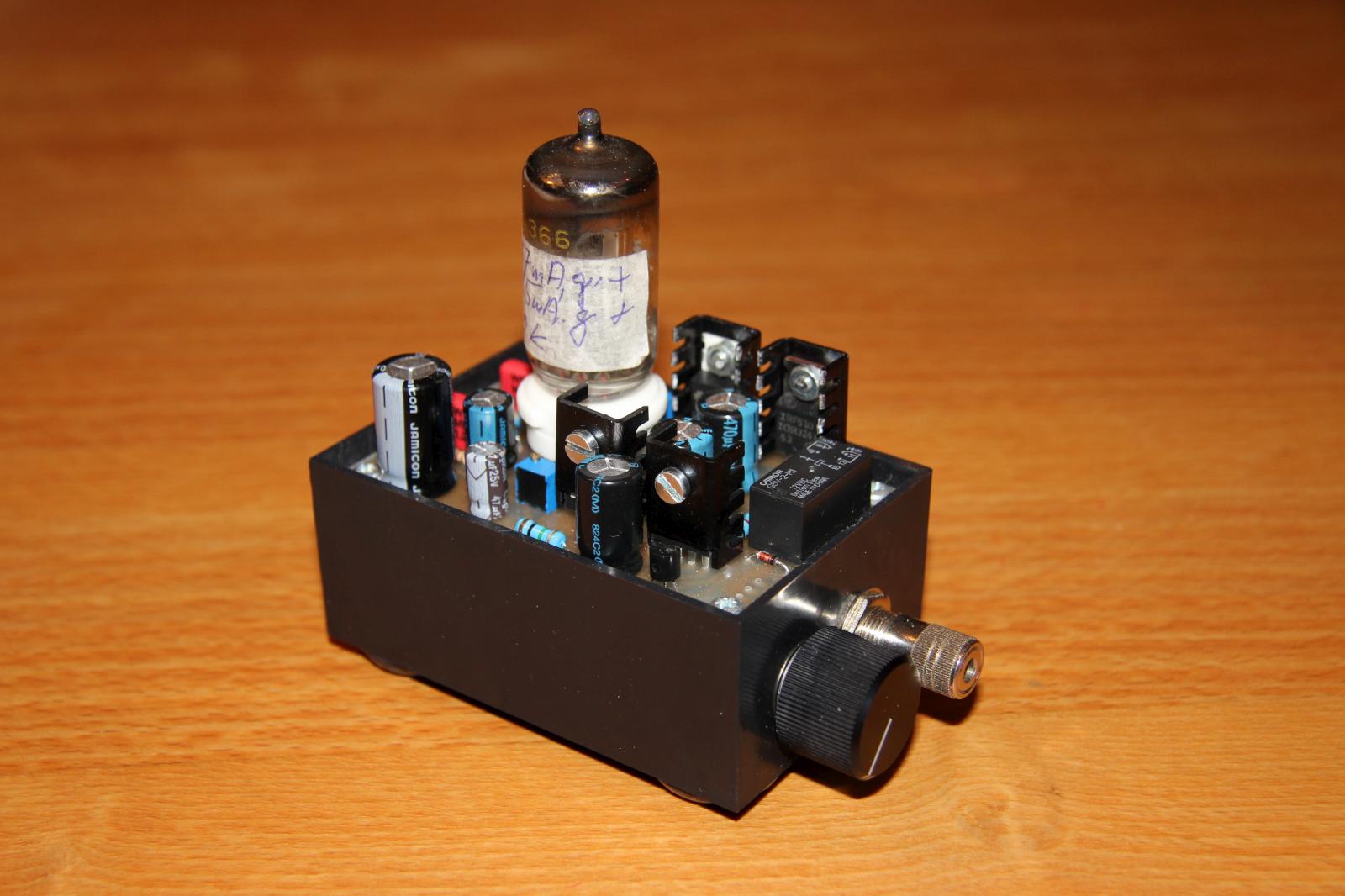 Den Schaltplan habe ich im Großen und Ganzen übernommen. Vor den Kopfhörerausgang habe ich eine Anschaltverzögerung basierend auf der Schaltung des Millet Hybrid MAX e12 Delay gesetzt. Die Verzögerung beträgt in etwa 30 Sekunden, bis dahin ist die Röhre warm und die Kapazitäten am Ausgang aufgeladen. Vom Aufbau der Schaltung habe ich leider keine Bilder. Es gab dabei ein Problem: die Bohrungen für den Röhrensockel waren zu klein, ich musste sie aufbohren und habe die Pads anschließend mit Silberdraht verstärkt.