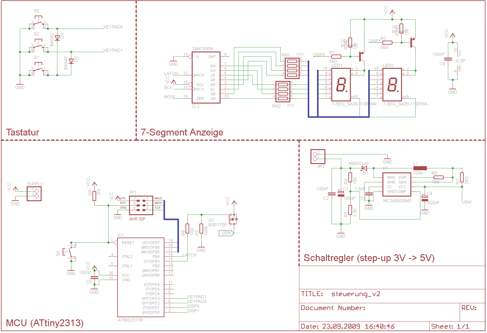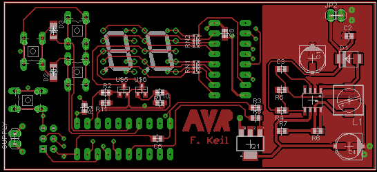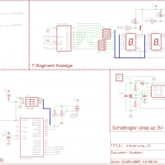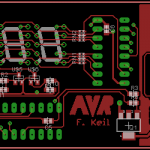 Das Drumherum war dann schnell gefunden: ein ATtiny2313 als Schaltzentrale, zwei 7 Segment LED-Anzeigen und drei Taster. Das Board habe ich mittlerweile auch fertig, jetzt muss ich nur noch die Teile bestellen, prüfen ob die passen, ein paar Tests machen und dann die Platinen ordern und bestücken.