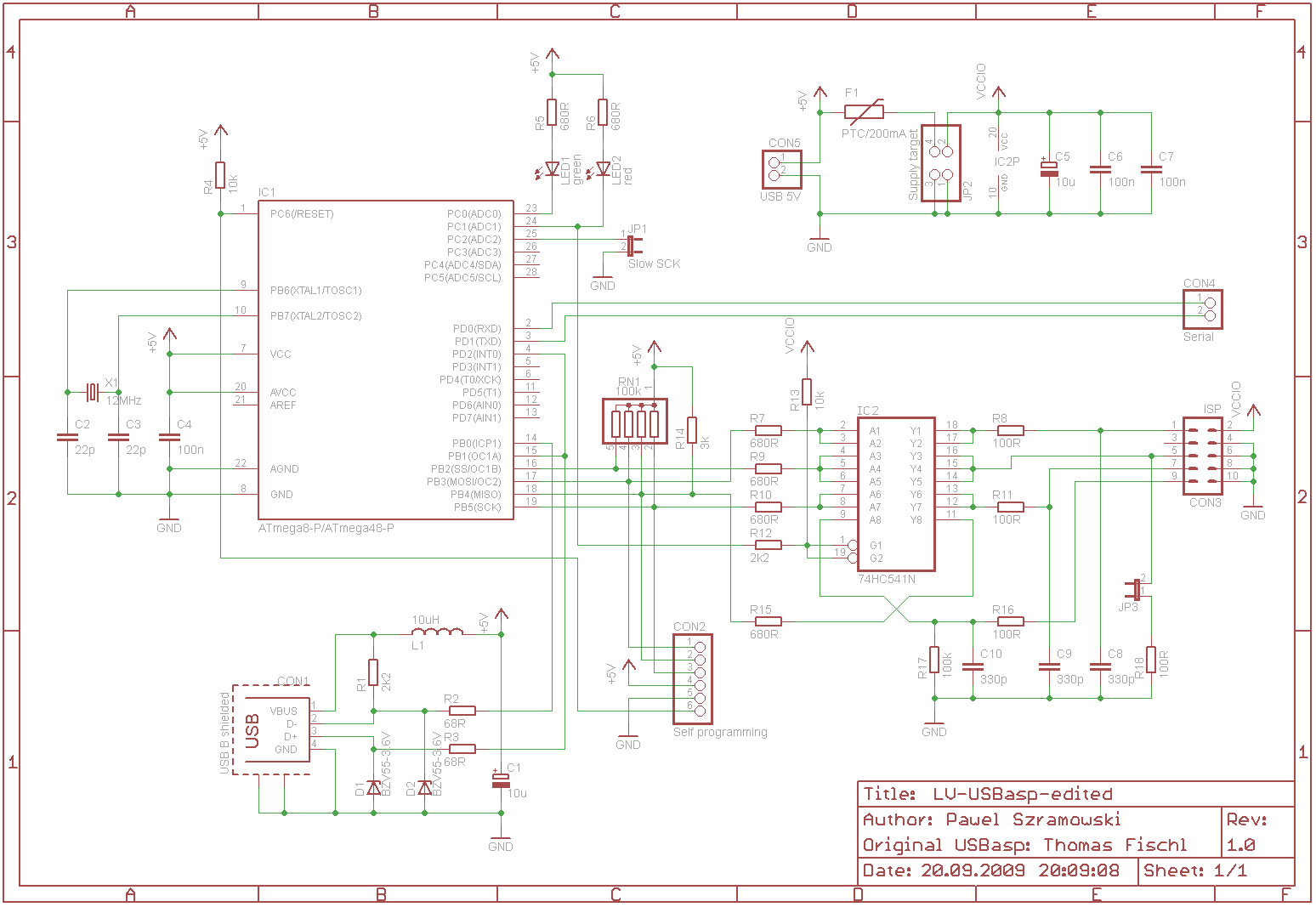 Außerdem habe ich noch die LV-USBasp Schaltung von Pawel Szramowski so angepasst, dass sie mit Teilen von Reichelt gebaut werden kann. Die Schaltung ist eine Abwandlung des AVR-ISP-Programmierers von Thomas Fischl.