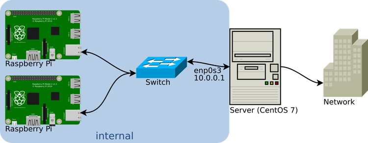 I will use this setup in a long-term experiment where a CentOS machine is controlling all the test-gear, including the Raspberry Pis. To separate the test-gear from the general network this machine is equipped with two network interfaces, where one (namely enp0s3) is used exclusively to talk to an internal network connecting to the test-gear. This network uses the 10.0.0.0/24 IP address range, with the CentOS machine being at 10.0.0.1. It will be added to the zone internal in the firewall. The figure below illustrates this setup.
