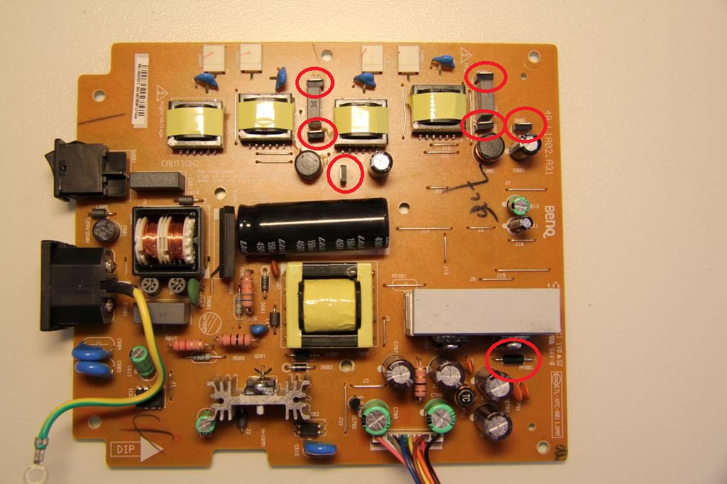 Update 11.10.2011: Die Netzteilplatine des HP L1955 hat die Bezeichnung Benq 48.L1A02.A00. Bei eBay finden sich bei einer Suche nach der Platine oder den Typbezeichnungen der defekten Transistoren (z.B. C5707 oder FU9024N) Bauteilkits für die Reperatur des Geräts.