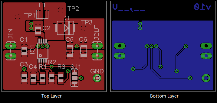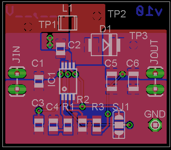 After the parts had been lying around for some time I finally had the time to layout a PCB to try them. The PCB layout is based on the layout of the TPS61085EVM evaluation module made by TI and the hints from the IC's datasheet. The resulting PCB is just 29.21 x 25.40 mm in size, although it could still be made smaller.