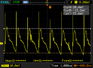 Of course I also determined the efficiency of the circuit. At a load current of 44 mA the efficiency turned out to be 82.75 %. Not too bad for a first revision. The complete data is shown below.