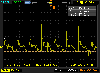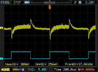 I originally planed to use this IC in a headphone amplifier, so I was curious about the transient response of the circuit. I replicated the measurement pictured in the datasheet to be able to compare the results. Two paralleled resistors were connected as load, one of them through a NPN transistor. A Teensy board was programmed to switch the transistor at 1 kHz and 50 % duty-cycle. The results are shown below.